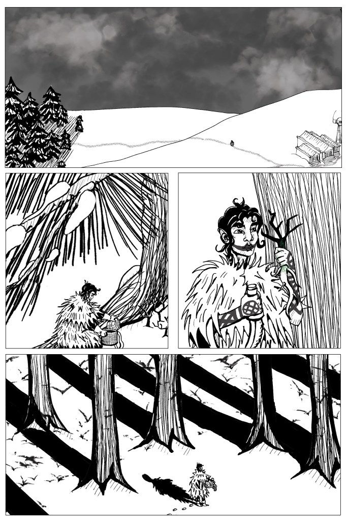 Panel 4: In another part of the forest, Resunotek walks among tall pines. Time has passed, and she and the trees cast long shadows. She holds her basket in both hands, and it is now full of roots, branches, and a number of mushrooms threaded on a string. She looks up and away from the viewer. The shadows of a flock of birds in flight are scattered among the trees’ shadows on the ground.