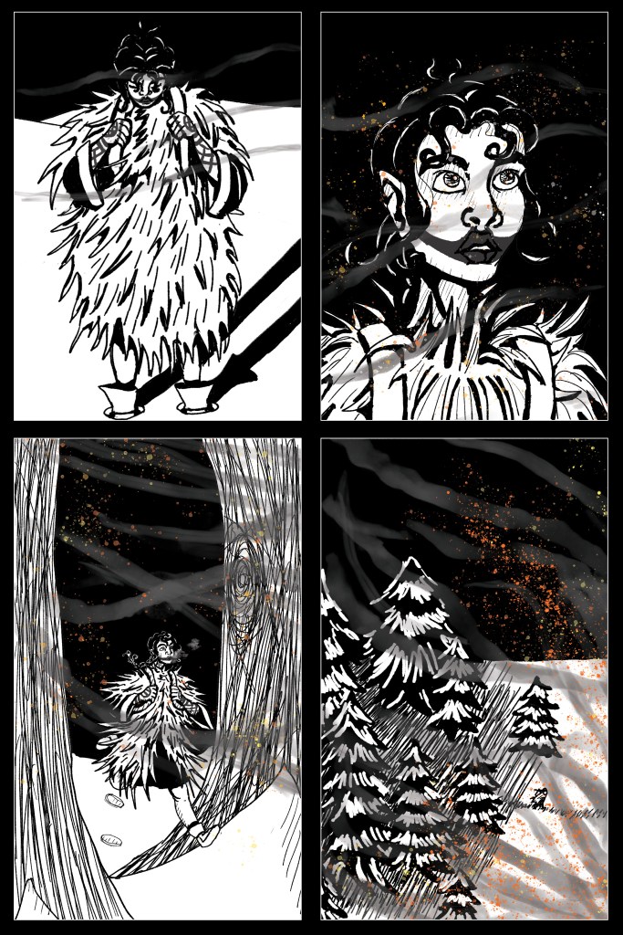 Panel 4: From far above, she exits the forest, leaving the snow-covered pines behind her. Even more smoke and sparks fill the air, emanating from the lower right corner.