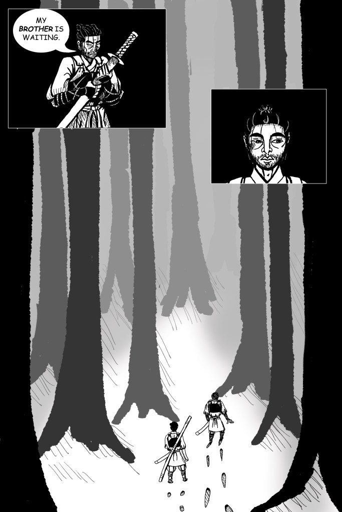 Panel 3: This panel is borderless and full-page behind the other panels. A forest of tall, straight trees is enshrouded in mist, and snow covers the ground beneath them. Ichiro and Tarahito make their way through the forest, Tarahito several steps ahead. His footprints drag through the snow, while Ichiro’s are steady.