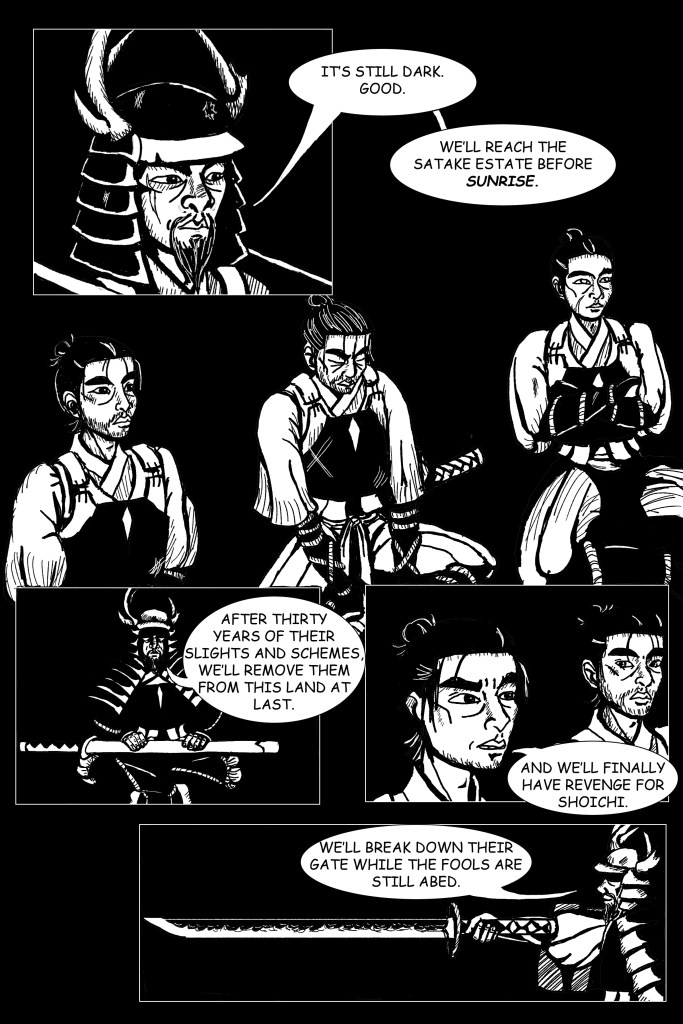 I did a panel with a detailed shot of the clan jito’s face on this page, and I’m considering leaving him in shadow when I do edits and redraws? Ichiro would definitely experience him mostly as a shadowy figure; this isn’t a close, affectionate family. Let me know what you think.