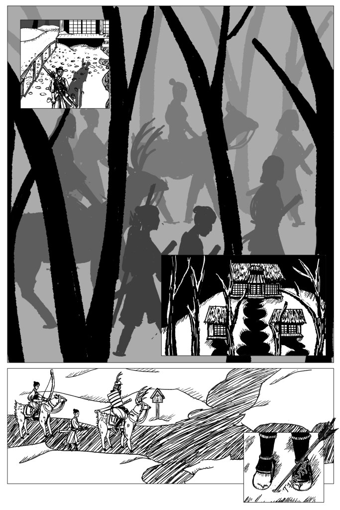 Panel 2: The clan samurai march through the woods in the fog, shown as silhouettes. Trees are in the foreground, with Ichiro (distinguished by his equipment) and his father (distinguished by his bent posture) behind them. Farther back, two deer riders and three other samurai on foot can be seen, as well as another line of trees in the background.