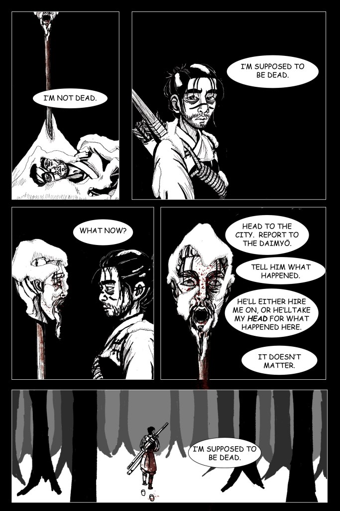 Panel 1: Now covered in snow, Ichiro wakes up again at the foot of the spike on which the jito’s head rests. He lies on his side facing the viewer, and the bottom half of the jito’s face is visible at the top of the panel.