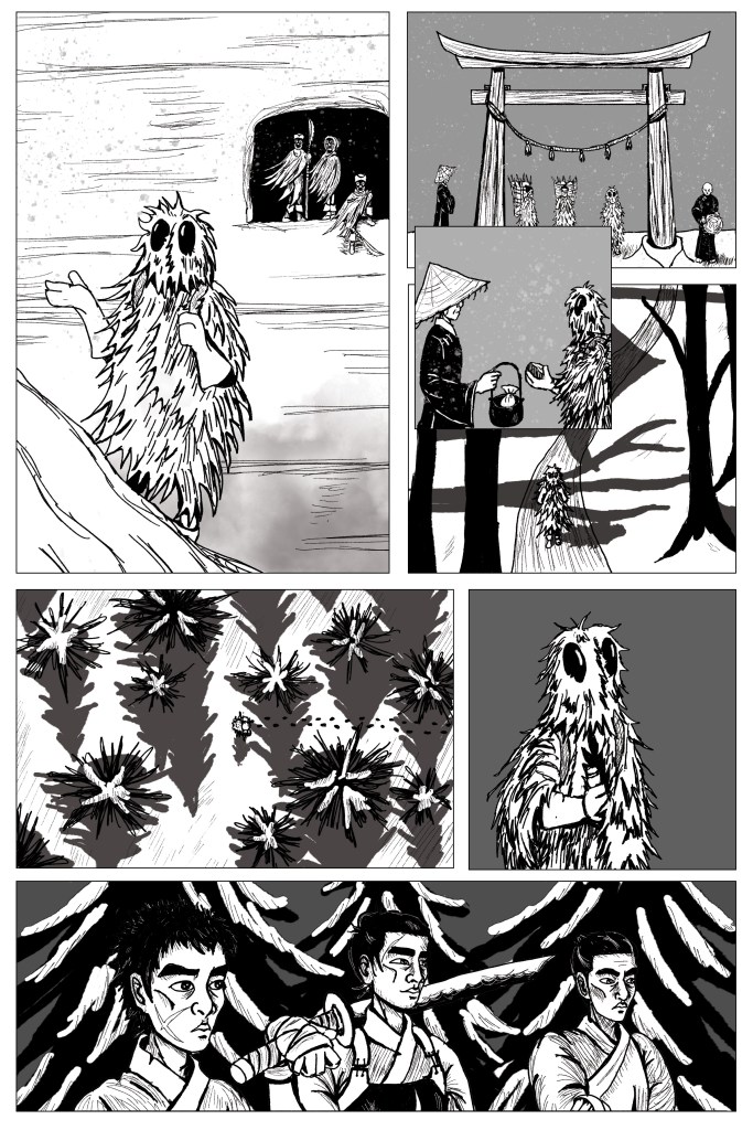 Panel 2: A worn torii gate marks the end of the path through the mistlands. A rope is strung between its pillars, from which dangle five tassels. Snow is falling, and piled up around the base of the pillar that is visible. Resunotek passes through the gate along with two merchants with giant baskets laden with bundles strapped to their backs. They wear similar straw cloaks to hers, but they wear only simple cloth masks tied around their lower faces. They are turned to one another in conversation. Outside the gate, two monks in long black robes stand watch. One wears a conical straw hat, while the other is holding his hat in his hands.