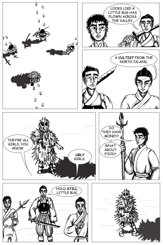 Panel 1: From above, and at a great distance, the tiny figures of the three men approach the tiny figure of Resunotek. In addition to her basket, she now has the rolled-up tent and the cooking pot on her back. Their shadows are tall, indicating late afternoon, with the sun coming from the west (the right of the panel). The man on the left has a spear, the one in the center has a sword over his shoulder, and the one on the right has his arms crossed.