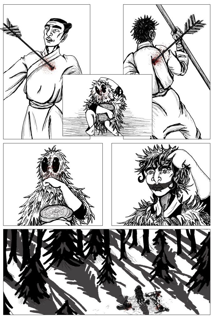 Panel 6: From a great distance and slightly above, Resunotek stands among the bodies of the bandits, looking into the trees. Her shadow, and those of the trees, are long and thin, with the light coming from behind the forest. The snow around her is disturbed and stained with blood.