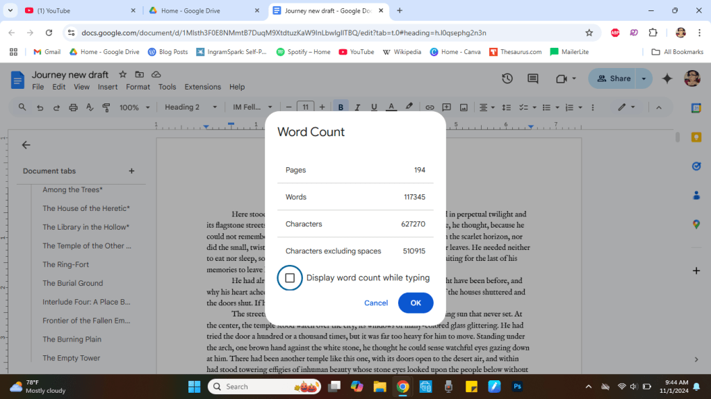 Clocking in at 31 chapters (including 5 interludes), 225 Google Docs pages, and 136,127 words, this is not the chunkiest book I’ve written (the honor still goes to The Book of the New Moon Door), but it’s taken a while. I continue to appreciate your patience as I work on getting it done.